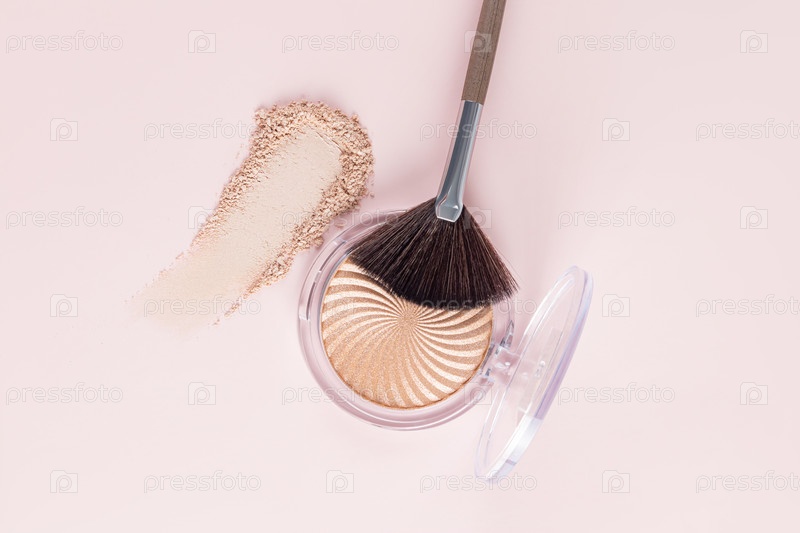 Шикарная открытая упаковка хайлайтера с блестками естественного тона, штрих, образец текстуры и веерная кисточка для макияжа на пастельном фоне. Вид сверху. Крупный план