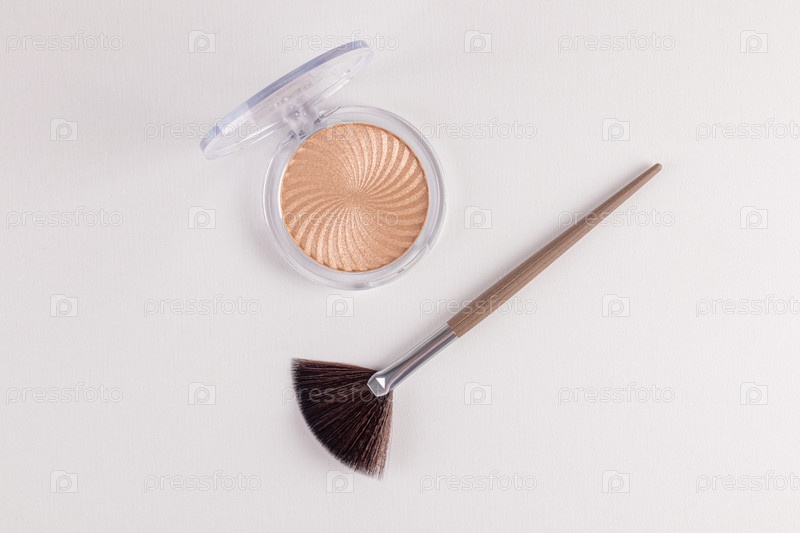 Круглая косметическая упаковка с шикарным хайлайтером естественный блеск. Веер профессиональная кисть для макияжа. Вид сверху. красота кожи декоративная косметика