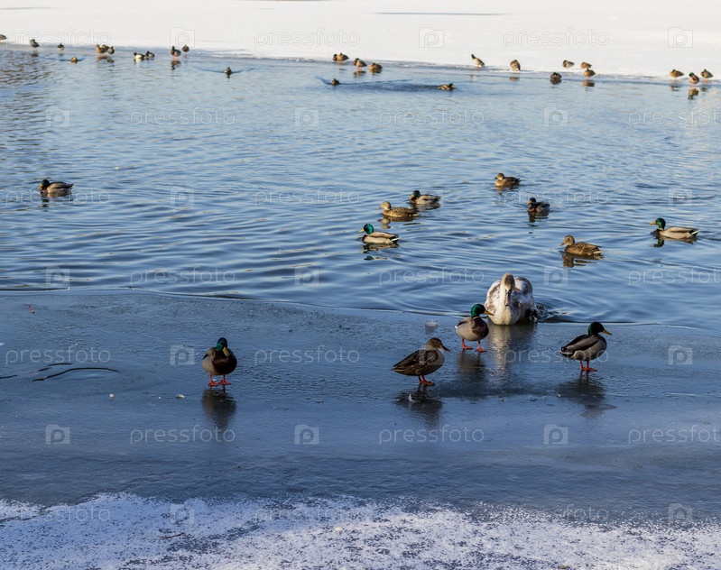 Утки и лебеди на замерзшем пруду. На открытом воздухе