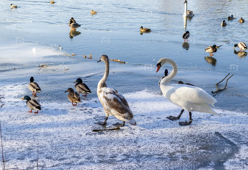Утки и лебеди на замерзшем пруду. На открытом воздухе