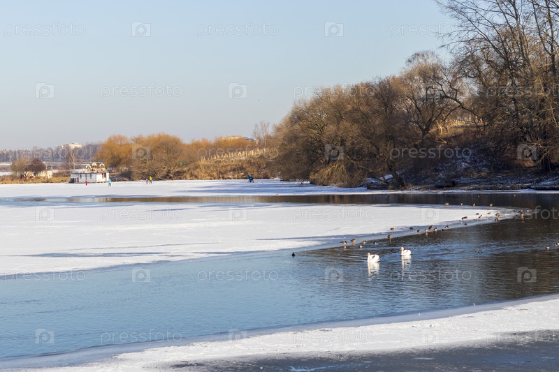 Утки и лебеди на замерзшем пруду. На открытом воздухе