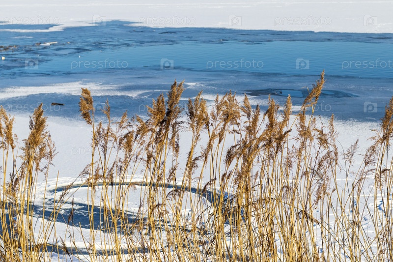 Сухой тростник на берегу замерзшего озера. Природа