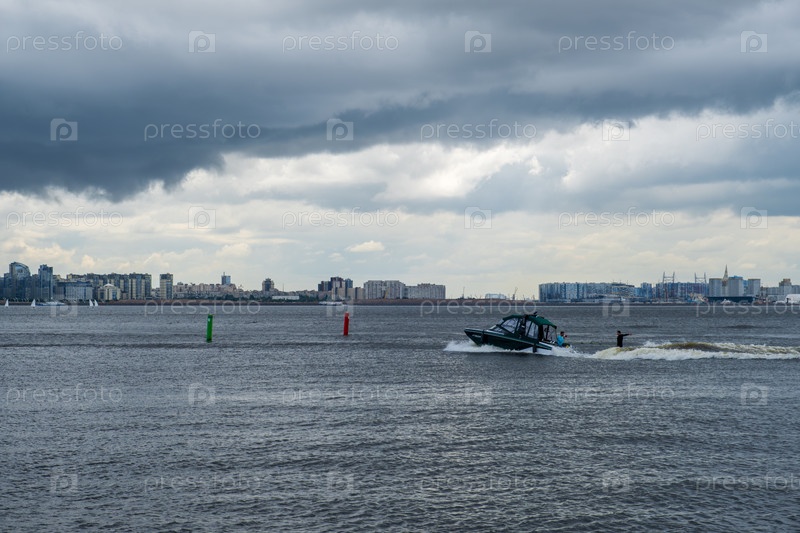 Городской пейзаж с набережной с высотными зданиями и водной гладью