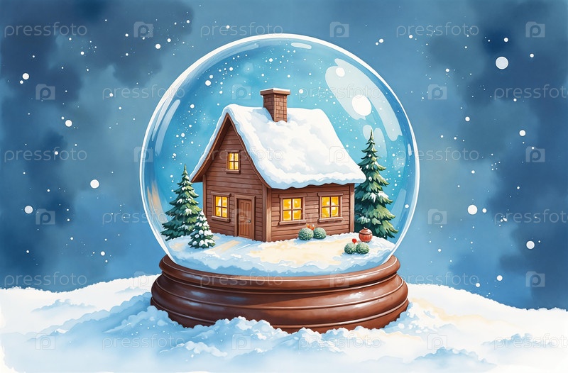 Дом в снежном шаре зимой, декор рождественская гирлянда, канун Нового года. Сгенерировано ИИ