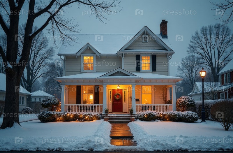 Фасад дома, вечер, снежная зима, рождественская гирлянда, канун Нового года. Создано с помощью искусственного интеллекта
