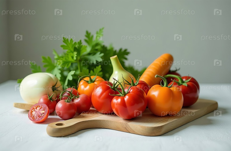 Натюрморт на столе, крупный план свежих овощей, яркая кухня. Генеративный ИИ