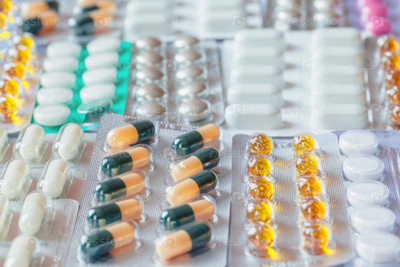 Куча разных медицинских таблеток и капсул, размытый фон