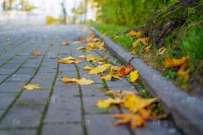 Опавшие желтые листья на тротуаре в парке
