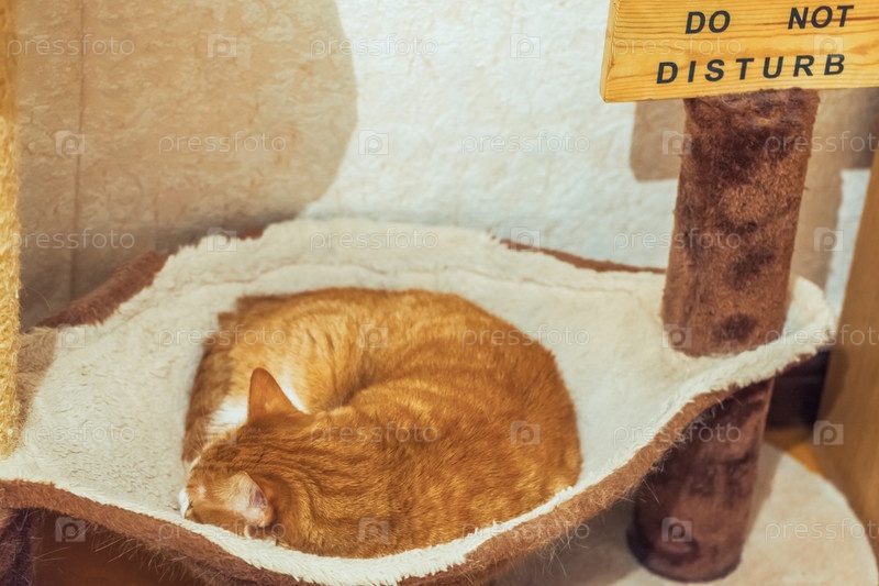 Рыжий кот спит в кошачьем домике с надписью «не беспокоить»