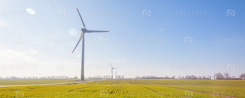 Ветряная турбина на зеленом поле с солнечными бликами на фоне голубого неба