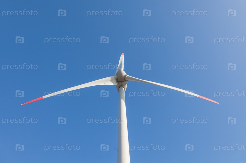 Ветряная турбина с солнечными бликами на фоне голубого неба, вид снизу