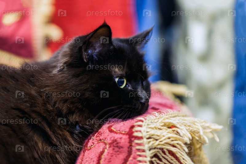 Черный кот с желтыми глазами отдыхает на диване, крупный план, портрет