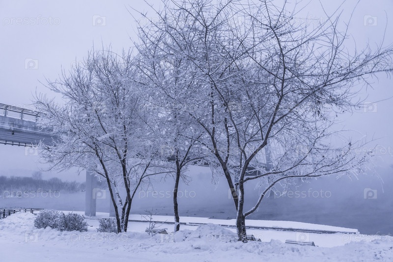 Раннее зимнее морозное утро над Енисеем в центре Красноярска