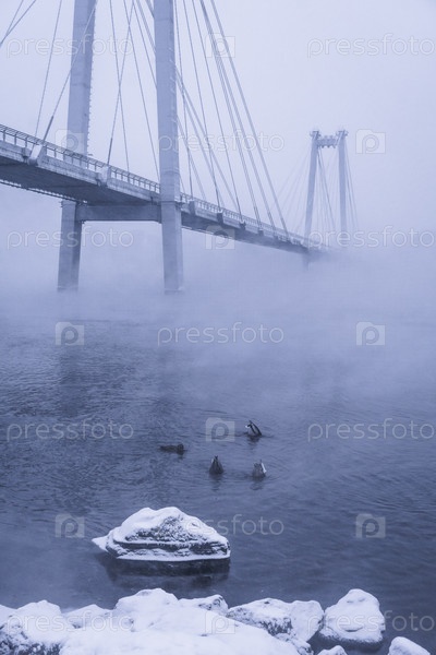 Раннее зимнее морозное утро над Енисеем в центре Красноярска