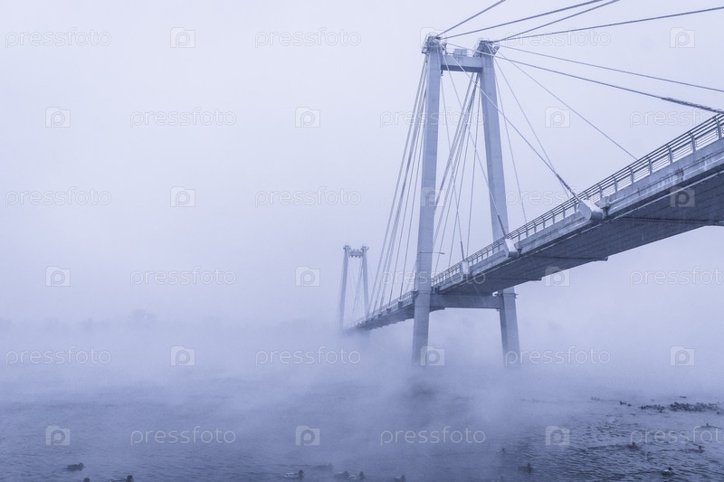 Раннее зимнее морозное утро над Енисеем в центре Красноярска