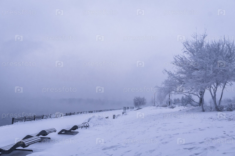 Раннее зимнее морозное утро над Енисеем в центре Красноярска