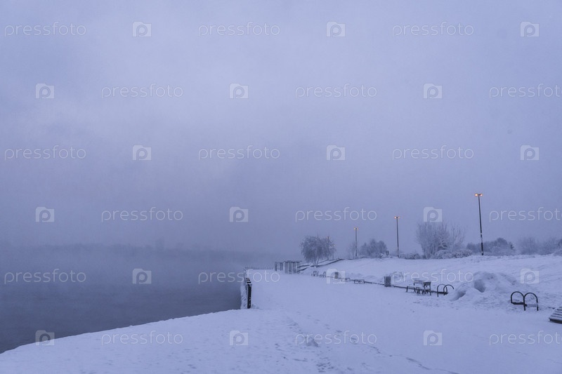 Раннее зимнее морозное утро над Енисеем в центре Красноярска