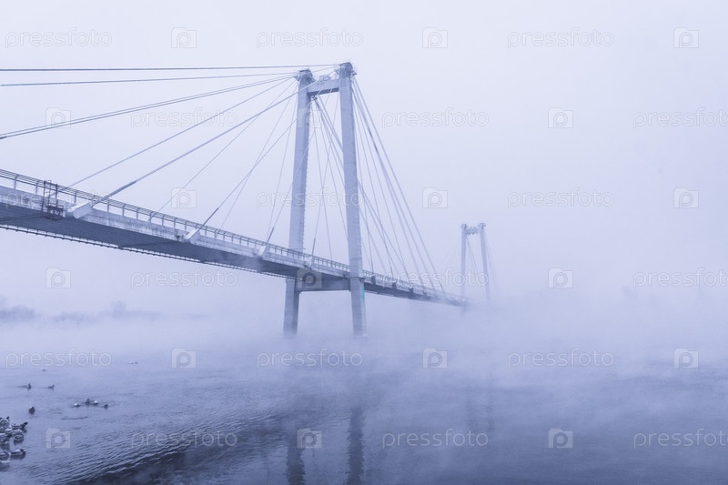 Раннее зимнее морозное утро над Енисеем в центре Красноярска
