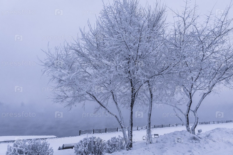 Раннее зимнее морозное утро над Енисеем в центре Красноярска