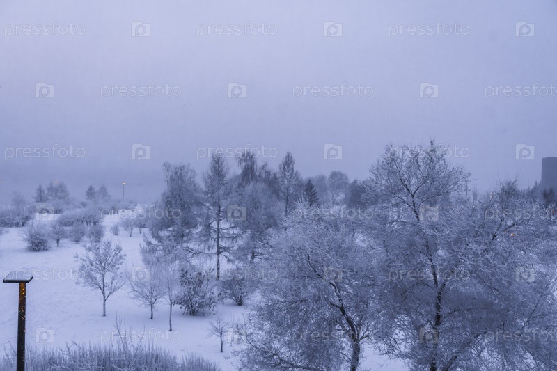 Раннее зимнее морозное утро над Енисеем в центре Красноярска