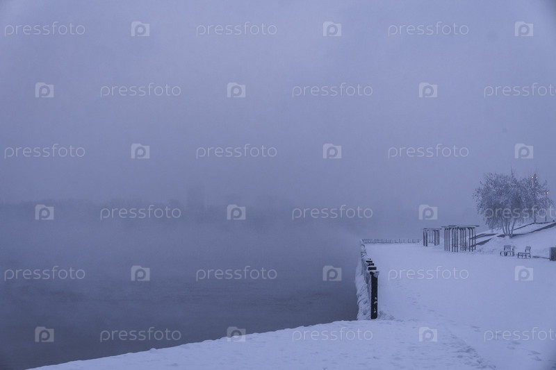 Раннее зимнее морозное утро над Енисеем в центре Красноярска