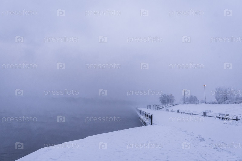 Раннее зимнее морозное утро над Енисеем в центре Красноярска