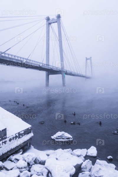Раннее зимнее морозное утро над Енисеем в центре Красноярска
