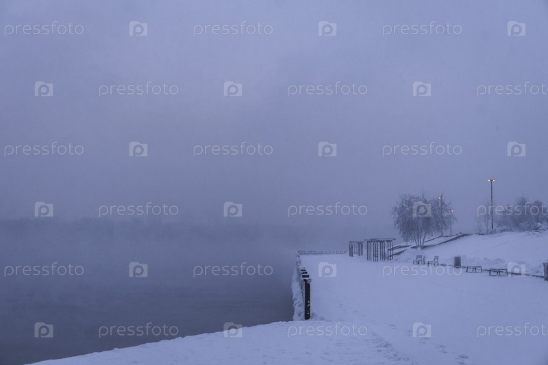 Раннее зимнее морозное утро над Енисеем в центре Красноярска