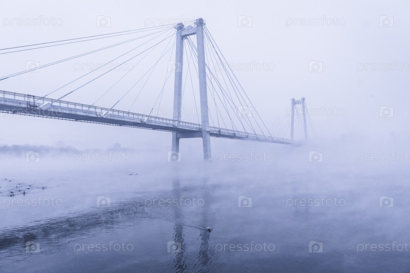 Раннее зимнее морозное утро над Енисеем в центре Красноярска