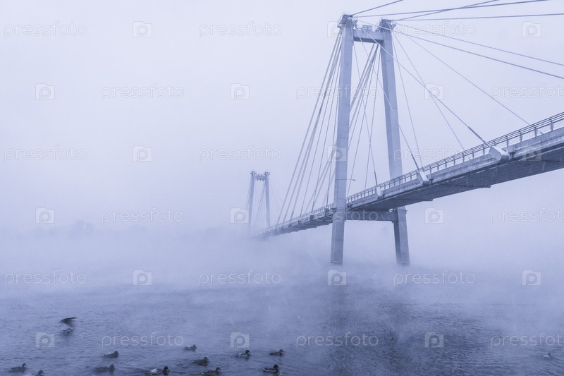 Раннее зимнее морозное утро над Енисеем в центре Красноярска