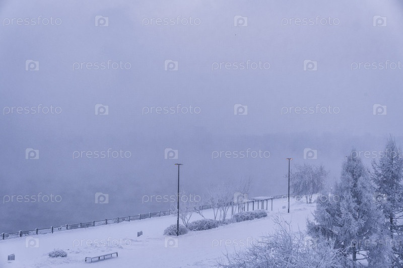 Раннее зимнее морозное утро над Енисеем в центре Красноярска