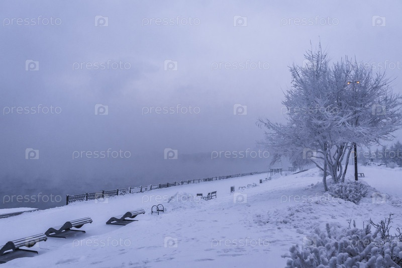 Раннее зимнее морозное утро над Енисеем в центре Красноярска