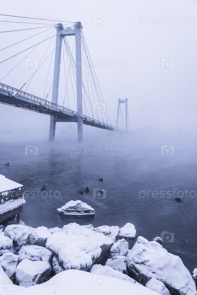 Раннее зимнее морозное утро над Енисеем в центре Красноярска