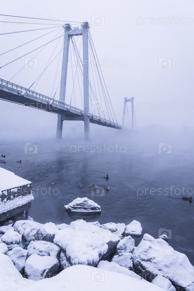 Раннее зимнее морозное утро над Енисеем в центре Красноярска