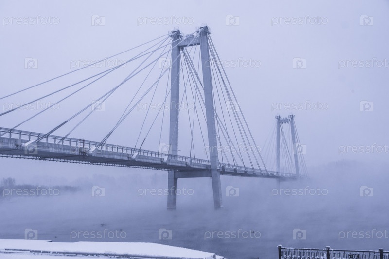 Раннее зимнее морозное утро над Енисеем в центре Красноярска