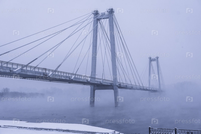 Раннее зимнее морозное утро над Енисеем в центре Красноярска