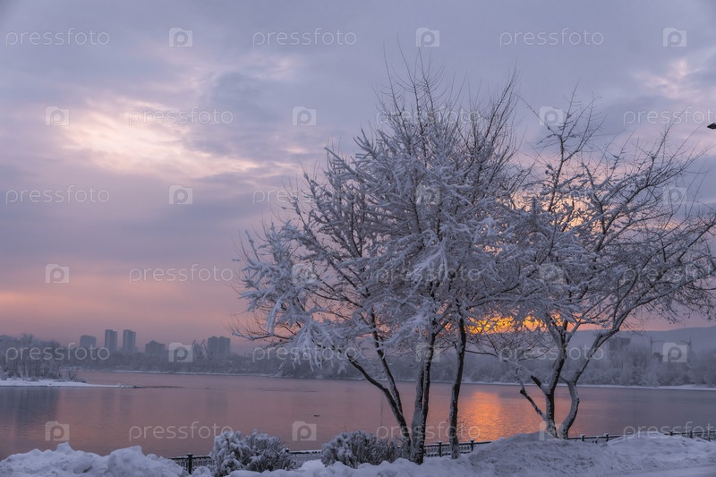 Раннее зимнее морозное утро над Енисеем в центре Красноярска