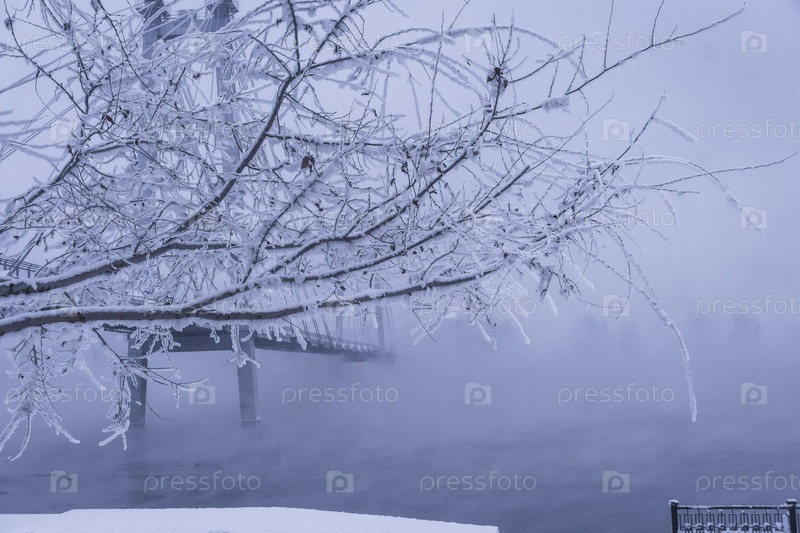 Раннее зимнее морозное утро над Енисеем в центре Красноярска