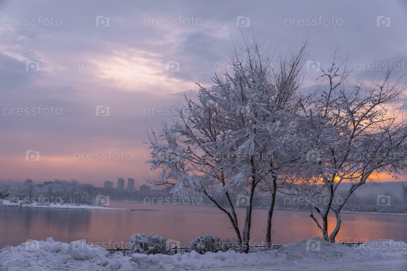 Раннее зимнее морозное утро над Енисеем в центре Красноярска