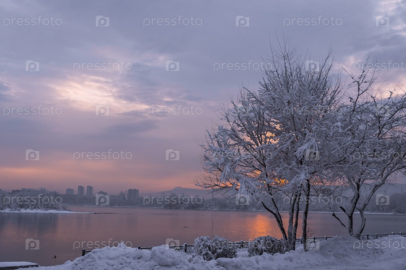 Раннее зимнее морозное утро над Енисеем в центре Красноярска