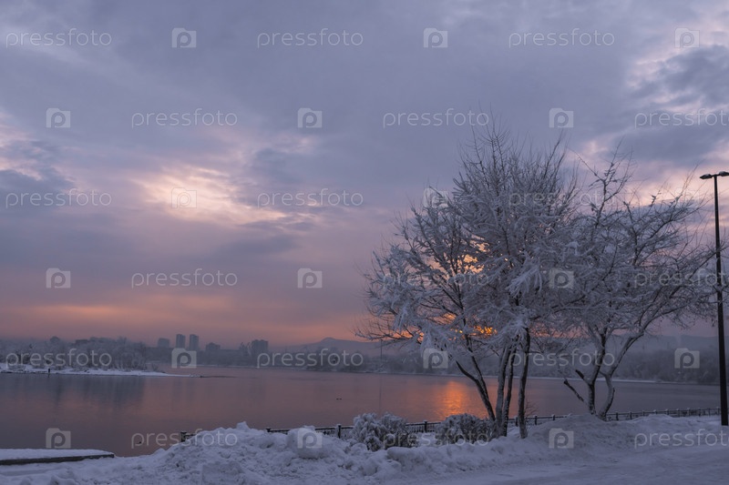 Раннее зимнее морозное утро над Енисеем в центре Красноярска