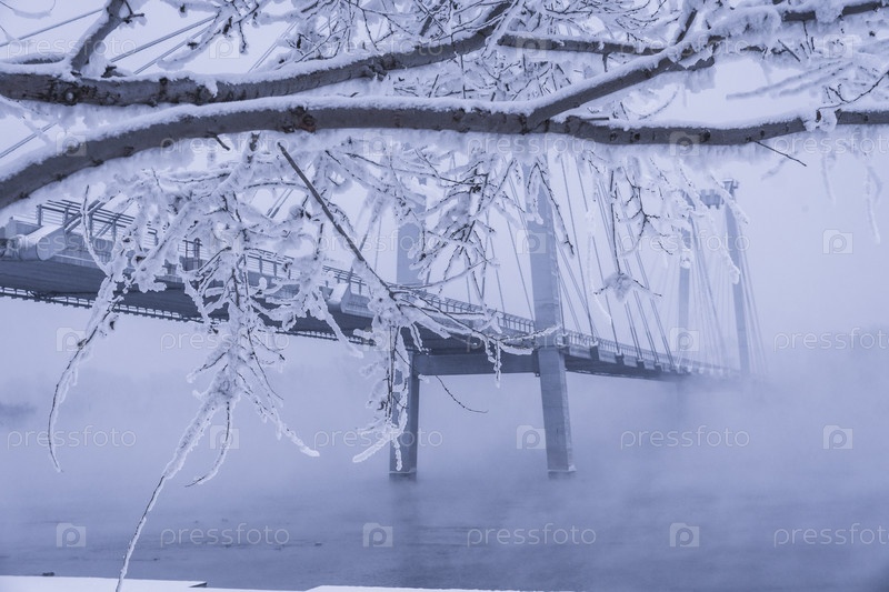 Раннее зимнее морозное утро над Енисеем в центре Красноярска