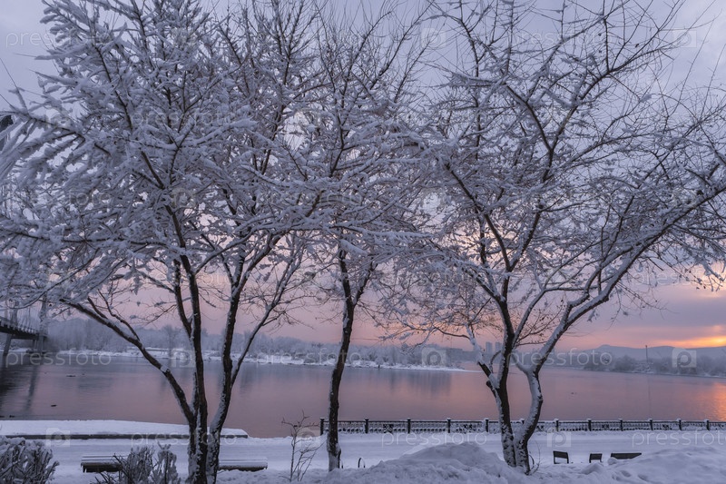 Раннее зимнее морозное утро над Енисеем в центре Красноярска