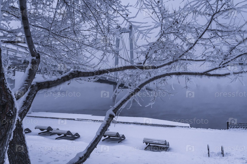 Раннее зимнее морозное утро над Енисеем в центре Красноярска
