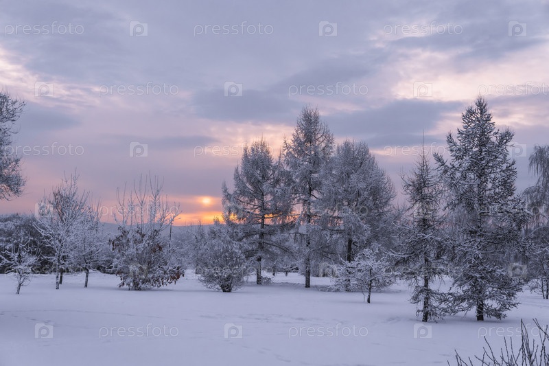 Раннее зимнее морозное утро над Енисеем в центре Красноярска