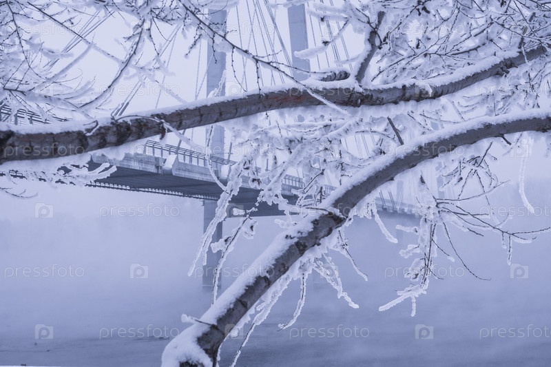Раннее зимнее морозное утро над Енисеем в центре Красноярска