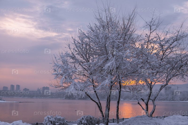 Раннее зимнее морозное утро над Енисеем в центре Красноярска