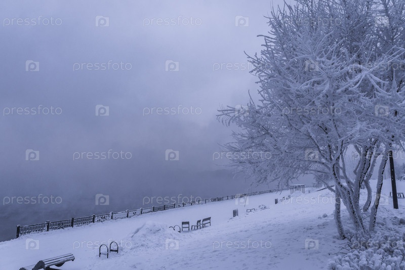 Раннее зимнее морозное утро над Енисеем в центре Красноярска
