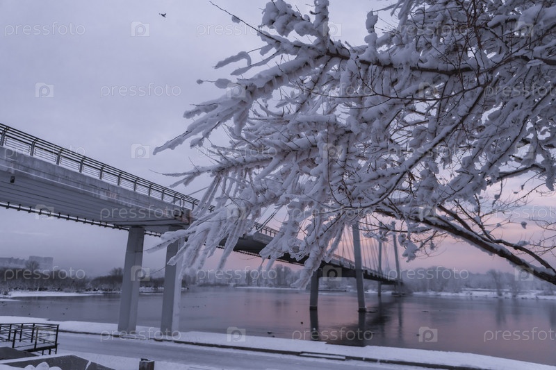 Раннее зимнее морозное утро над Енисеем в центре Красноярска