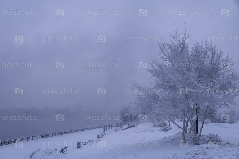 Раннее зимнее морозное утро над Енисеем в центре Красноярска